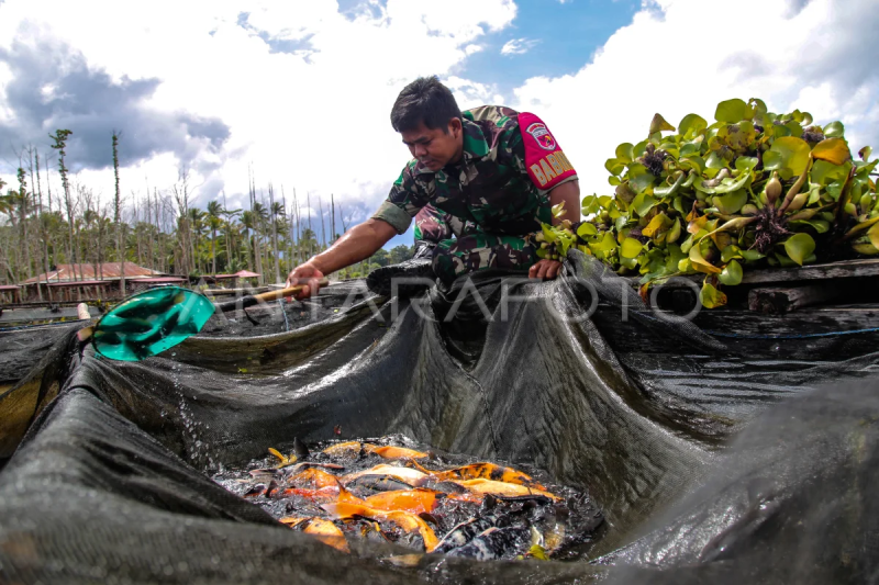 Anggota TNI AD Pembina Desa (Babinsa) Koramil 1508-Galela Sersan Mayor Ardi Wijaya mengambil ikan nila yang dibudidayakan di Danau talaga duma, Desa Togawa Besi, Kabupaten Halmahera Utara, Maluku Utara, Rabu (22/11/2023). Sersan Mayor Ardi Wijaya memanfaatkan danau telaga duma untuk budidaya berbagai jenis ikan nila dengan menggunakan sistem keramba apung itu sejak 2016 sekaligus memenuhi permintaan sejumlah rumah makan di Tobelo yang dijual Rp60 ribu per kilogram serta jadikan motivasi kepada masyarakat untuk membudidayakan ikan nila. ANTARA FOTO/Andri Saputra/aww.