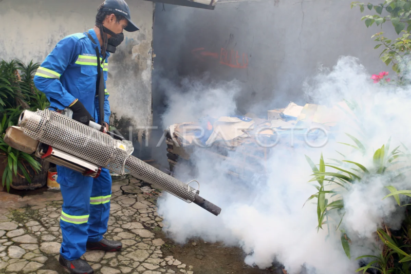 Petugas dari Puskesmas Kebayoran Lama melakukan pengasapan (fogging) rumah warga untuk mencegah perkembangbiakan nyamuk di Cipulir, Kebayoran Lama, Jakarta, Kamis (16/5/2024). Pengasapan dilakukan karena adanya sejumlah warga di kawasan tersebut yang terkena penyakit demam berdarah dengue (DBD) yang disebabkan oleh gigitan nyamuk Aedes aegypti. ANTARA FOTO/Muhammad Iqbal/tom.