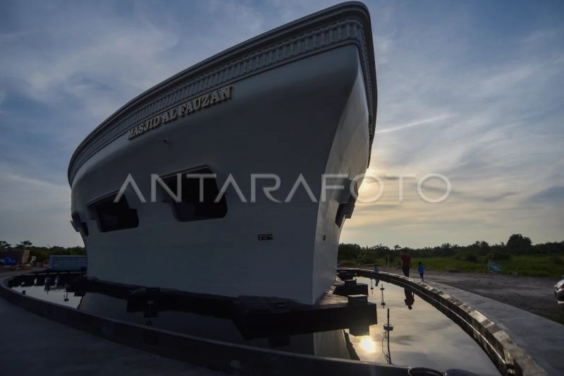 Pengunjung singgah untuk berbuka puasa dan Shalat Maghrib di Masjid Al Fauzan, Nagari Katapiang, Padang Pariaman, Sumatera Barat, Sabtu (28/2/2026). Masjid dengan bentuk kapal pesiar setinggi 28 meter yang berada tidak jauh dari Bandara Internasional Minangkabau (BIM) itu sudah dibuka untuk umum meskipun masih dalam tahap penyelesaian pembangunan. ANTARA FOTO/Fitra Yogi/wsj.