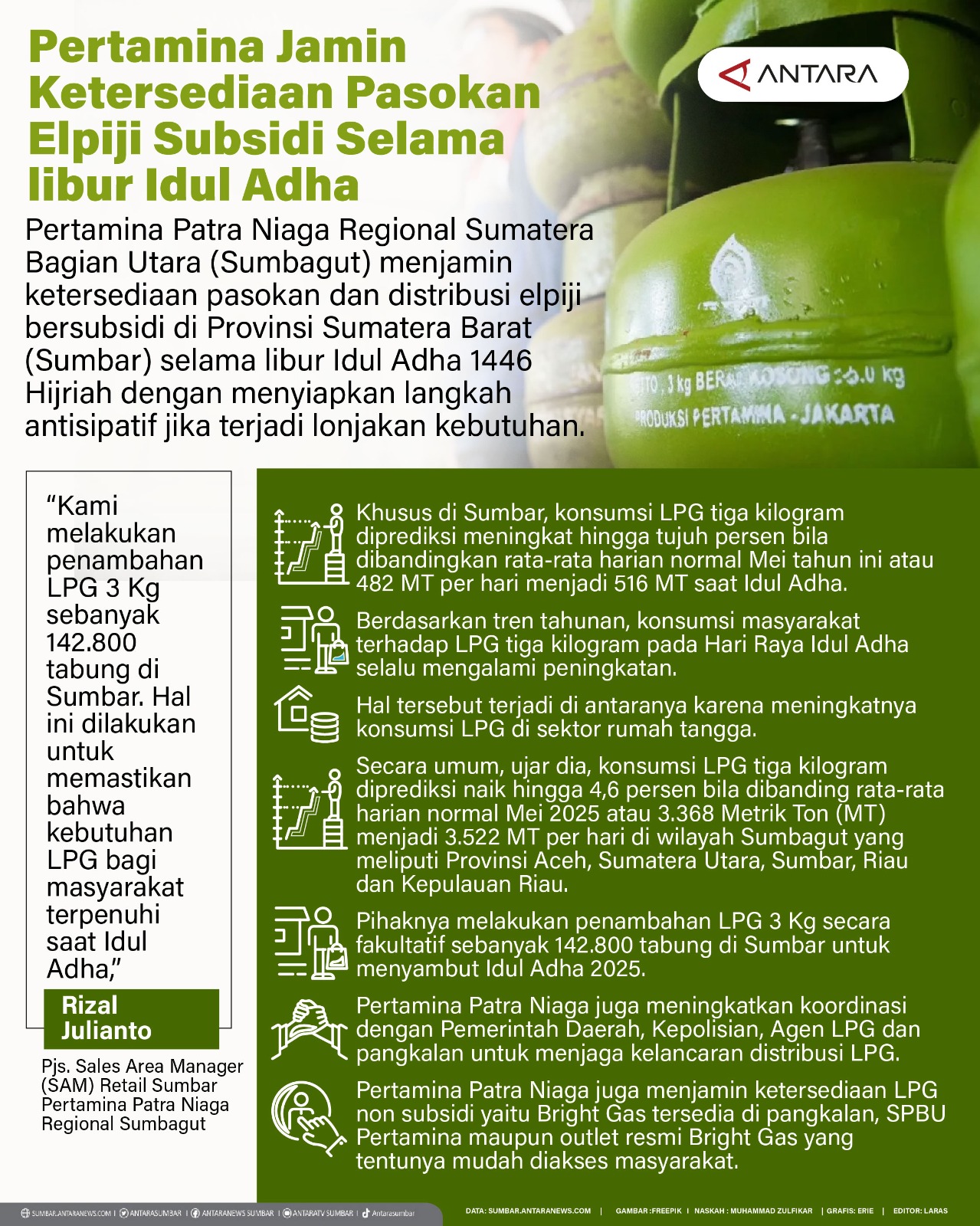 Pertamina Patra Niaga Regional Sumatera bagian Utara (Sumbagut) menjamin ketersediaan pasokan dan distribusi elpiji bersubsidi di Provinsi Sumatera Barat selama libur Idul Adha 1446 Hijriah