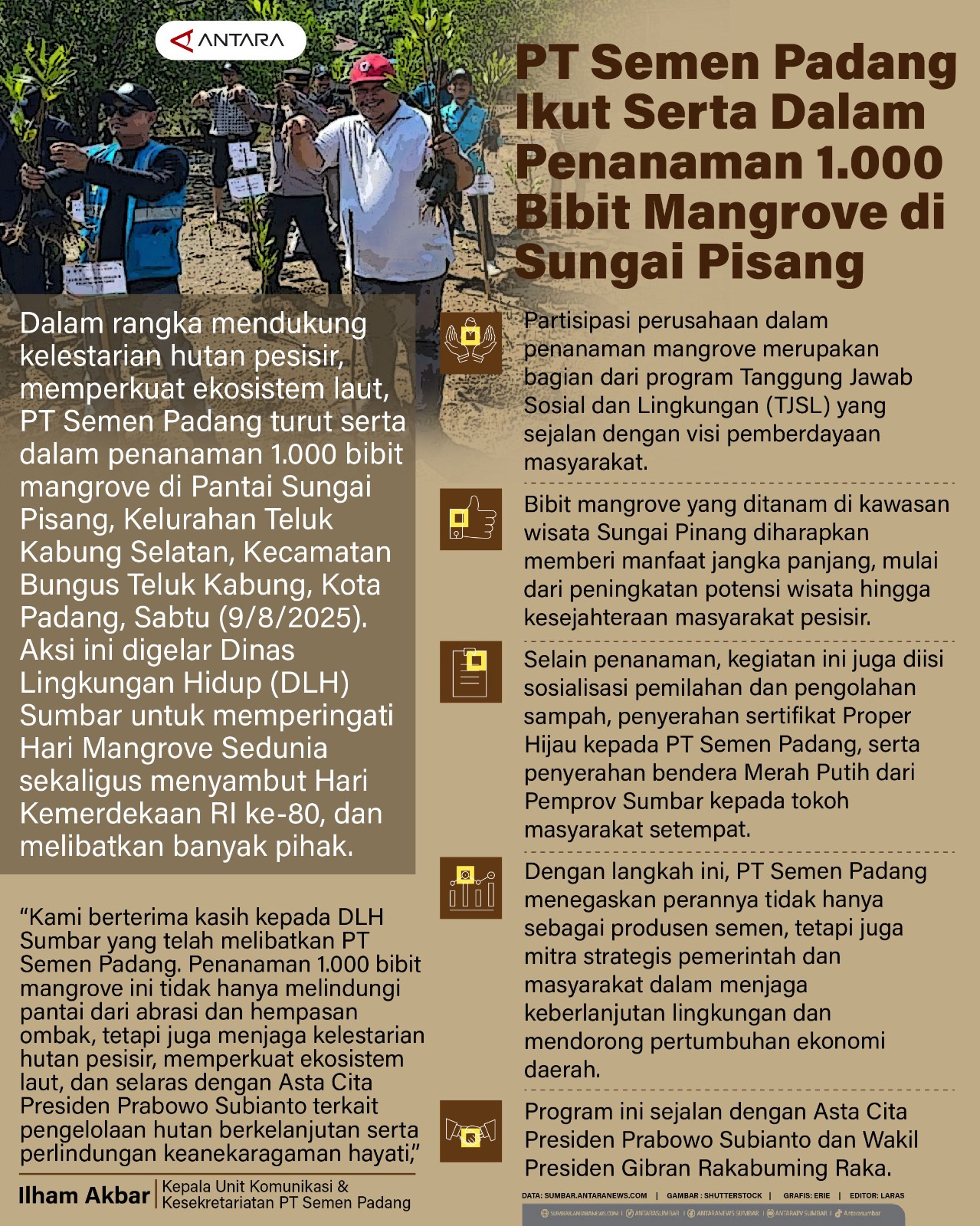 Dalam rangka mendukung kelestarian hutan pesisir, memperkuat ekosistem laut, PT Semen Padang turut serta dalam penanaman 1.000 bibit mangrove di Pantai Sungai Pisang, Kelurahan Teluk Kabung Selatan, Kecamatan Bungus Teluk Kabung, Kota Padang, Sabtu (9/8/2025). Aksi ini digelar Dinas Lingkungan Hidup (DLH) Sumbar untuk memperingati Hari Mangrove Sedunia sekaligus menyambut Hari Kemerdekaan RI ke-80, dan melibatkan banyak pihak.