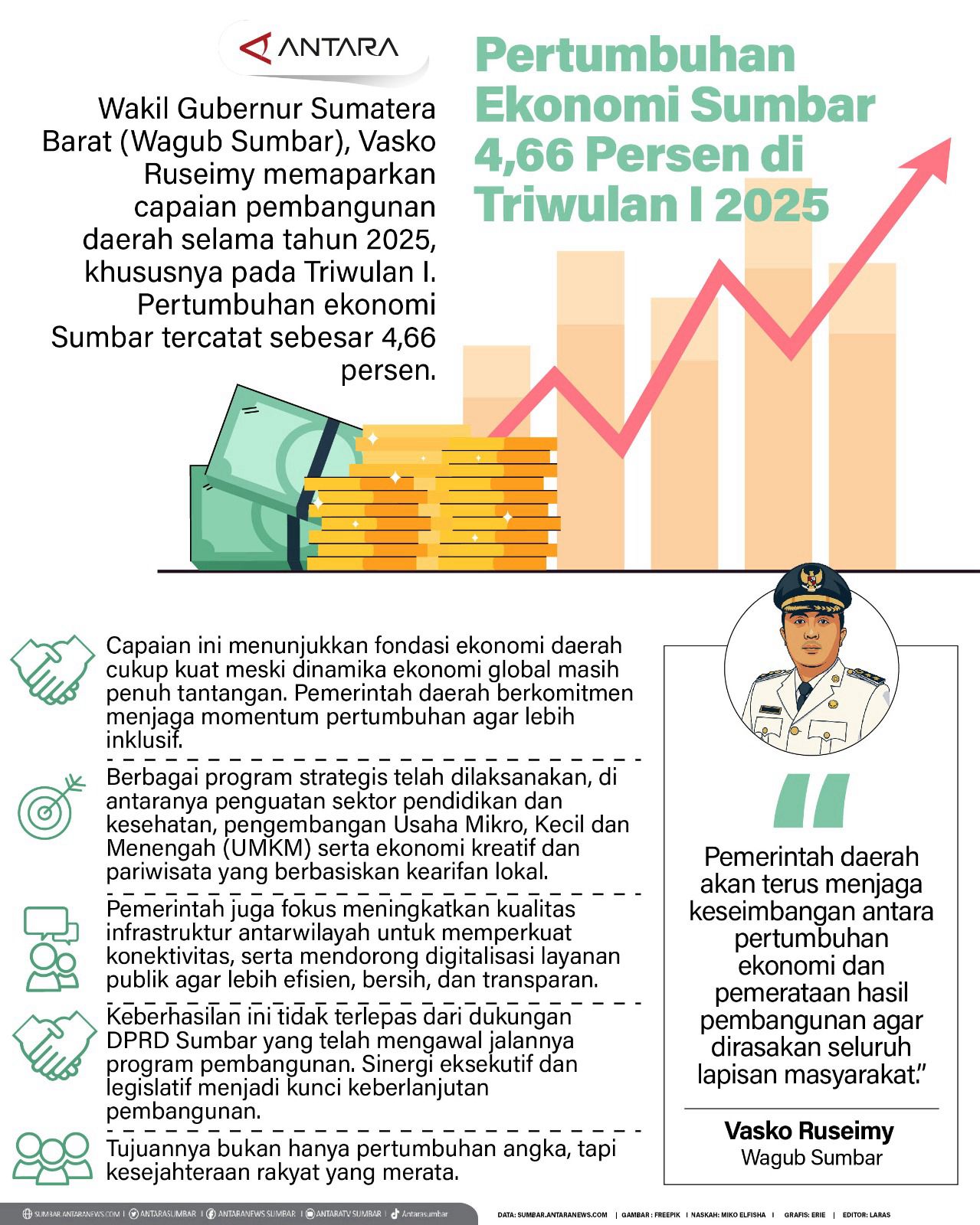 Wakil Gubernur Sumatera Barat (Wagub Sumbar), Vasko Ruseimy memaparkan capaian pembangunan daerah selama tahun 2025, khususnya pada Triwulan I. Pertumbuhan ekonomi Sumbar tercatat sebesar 4,66 persen.
