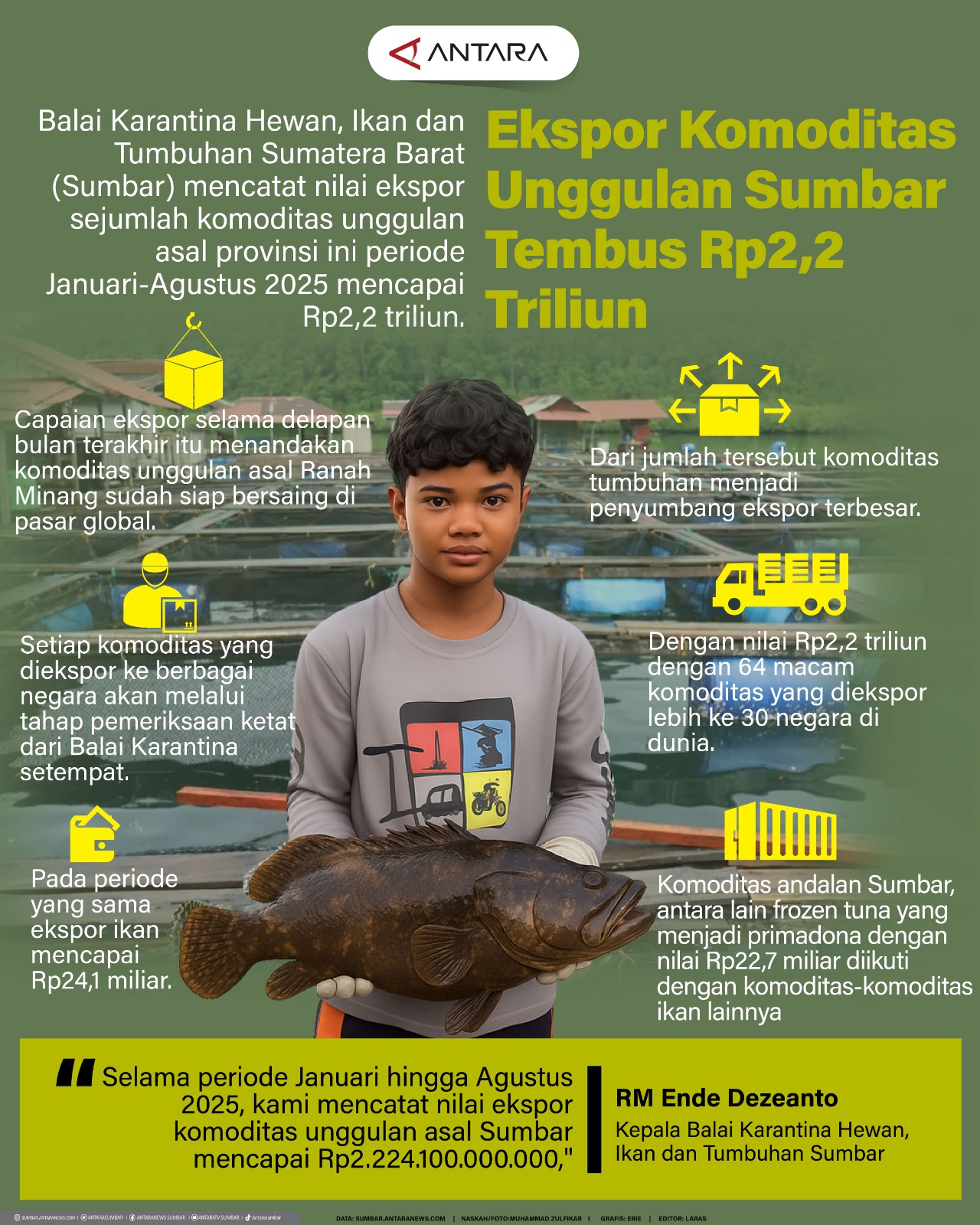 Ekspor komoditas unggulan Sumbar tembus Rp2,2 triliun Senin, 15 September 2025 14:49 WIB Balai Karantina Hewan, Ikan dan Tumbuhan Sumatera Barat (Sumbar) mencatat nilai ekspor sejumlah komoditas unggulan asal provinsi ini periode Januari-Agustus 2025 mencapai Rp2,2 triliun. COPYRIGHT © ANTARA SUMBAR 2025 facebook Twitter Whatsapp pinterest