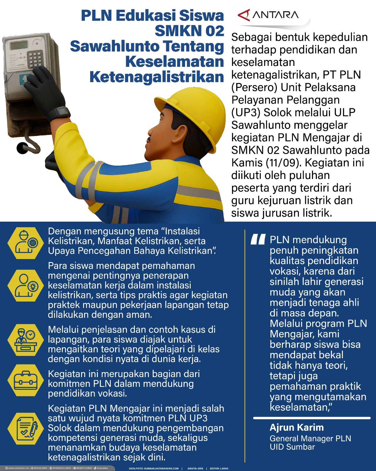 Sebagai bentuk kepedulian terhadap pendidikan dan keselamatan ketenagalistrikan, PT PLN (Persero) Unit Pelaksana Pelayanan Pelanggan (UP3) Solok melalui ULP Sawahlunto menggelar kegiatan PLN Mengajar di SMKN 02 Sawahlunto pada Kamis (11/09). Kegiatan ini diikuti oleh puluhan peserta yang terdiri dari guru kejuruan listrik dan siswa jurusan listrik.