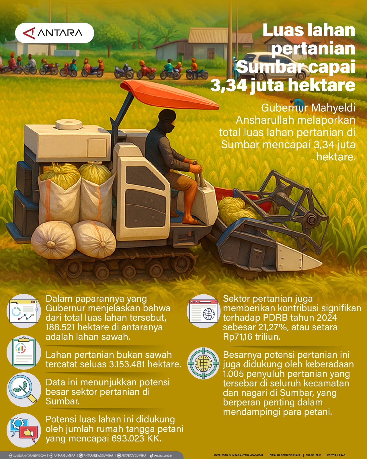 Luas lahan pertanian Sumbar capai 3,34 juta hektare Kamis, 18 September 2025 15:50 WIB Gubernur Mahyeldi Ansharullah melaporkan total luas lahan pertanian di Sumbar mencapai 3,34 juta hektare. COPYRIGHT © ANTARA SUMBAR 2025 facebook Twitter Whatsapp pinterest