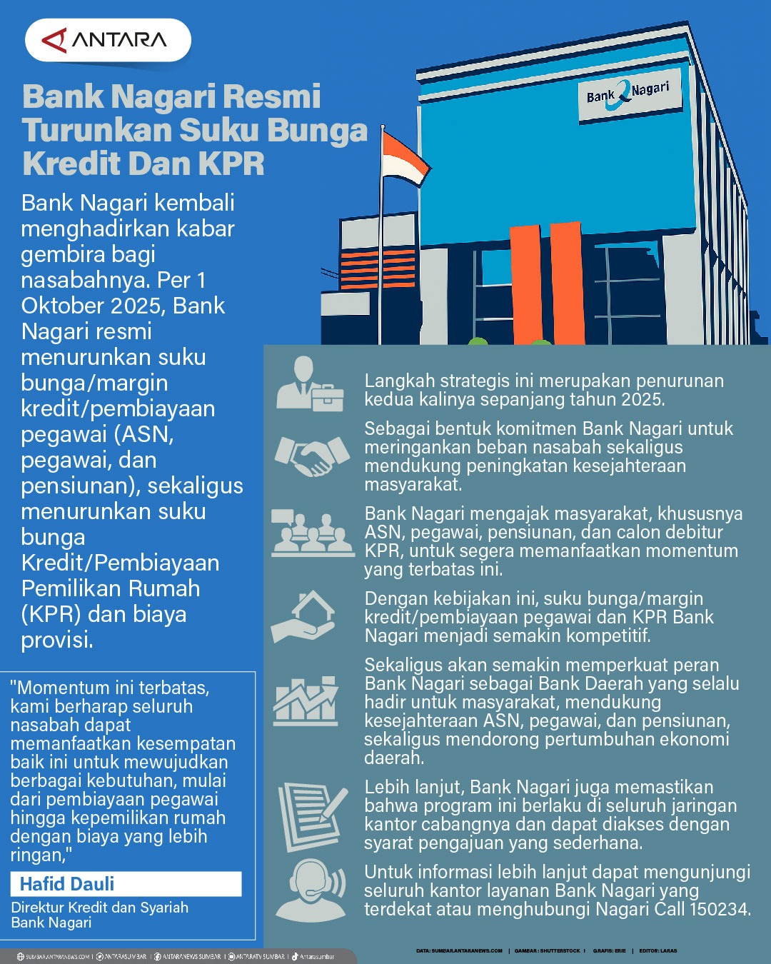Bank Nagari kembali menghadirkan kabar gembira bagi nasabahnya. Per 1 Oktober 2025, Bank Nagari resmi menurunkan suku bunga/margin kredit/pembiayaan pegawai (ASN, pegawai, dan pensiunan), sekaligus menurunkan suku bunga Kredit/Pembiayaan Pemilikan Rumah (KPR) dan biaya provisi.