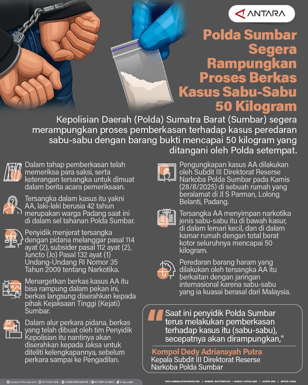 Kepolisian Daerah (Polda) Sumatra Barat (Sumbar) segera merampungkan proses pemberkasan terhadap kasus peredaran sabu-sabu dengan barang bukti mencapai 50 kilogram yang ditangani oleh Polda setempat.