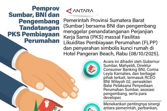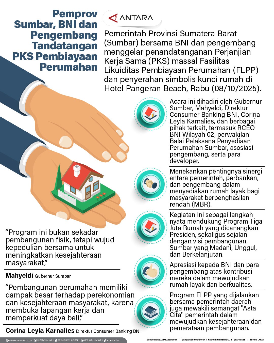 Pemerintah Provinsi Sumatera Barat (Sumbar) bersama BNI dan pengembang menggelar penandatanganan Perjanjian Kerja Sama (PKS) massal Fasilitas Likuiditas Pembiayaan Perumahan (FLPP) dan penyerahan simbolis kunci rumah di Hotel Pangeran Beach, Rabu (08/10/2025).