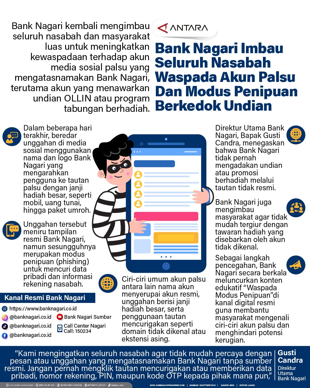 Bank Nagari kembali mengimbau seluruh nasabah dan masyarakat luas untuk meningkatkan kewaspadaan terhadap akun media sosial palsu yang mengatasnamakan Bank Nagari, terutama akun yang menawarkan undian OLLIN atau program tabungan berhadiah.