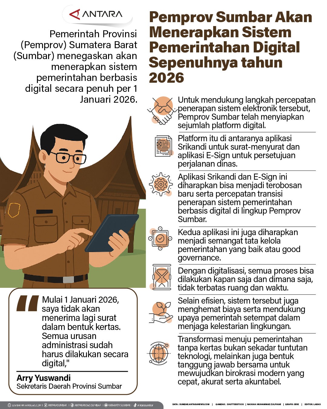 Pemprov Sumbar akan menerapkan sistem pemerintahan digital sepenuhnya tahun 2026 Selasa, 4 November 2025 15:23 WIB Pemerintah Provinsi (Pemprov) Sumatera Barat (Sumbar) menegaskan akan menerapkan sistem pemerintahan berbasis digital secara penuh per 1 Januari 2026. COPYRIGHT © ANTARA SUMBAR 2025 facebook Twitter Whatsapp pinterest