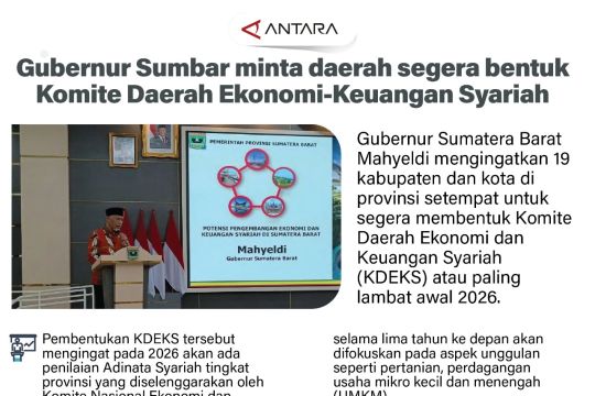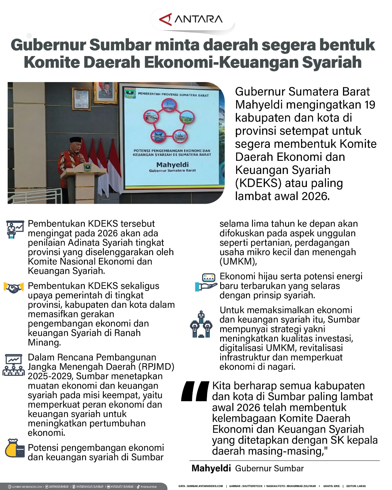Gubernur Sumatera Barat Mahyeldi mengingatkan 19 kabupaten dan kota di provinsi setempat untuk segera membentuk Komite Daerah Ekonomi dan Keuangan Syariah (KDEKS) atau paling lambat awal 2026.