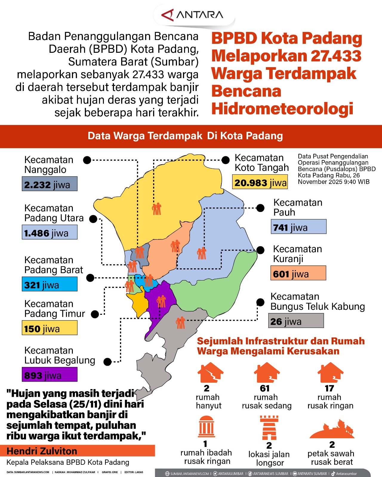 Badan Penanggulangan Bencana Daerah (BPBD) Kota Padang, Sumatera Barat (Sumbar) melaporkan sebanyak 27.433 warga di daerah tersebut terdampak banjir akibat hujan deras yang terjadi sejak beberapa hari terakhir.