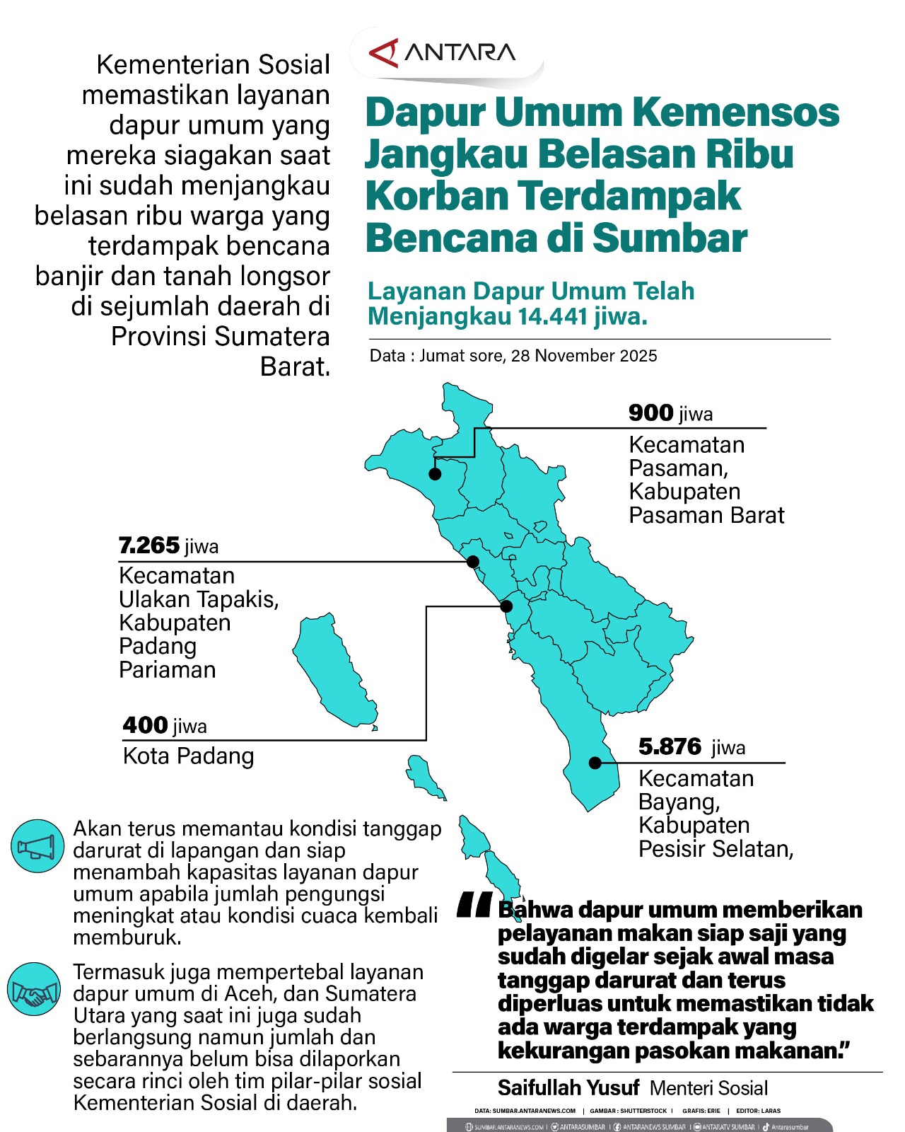 Kementerian Sosial memastikan layanan dapur umum yang mereka siagakan saat ini sudah menjangkau belasan ribu warga yang terdampak bencana banjir dan tanah longsor di sejumlah daerah di Provinsi Sumatera Barat.