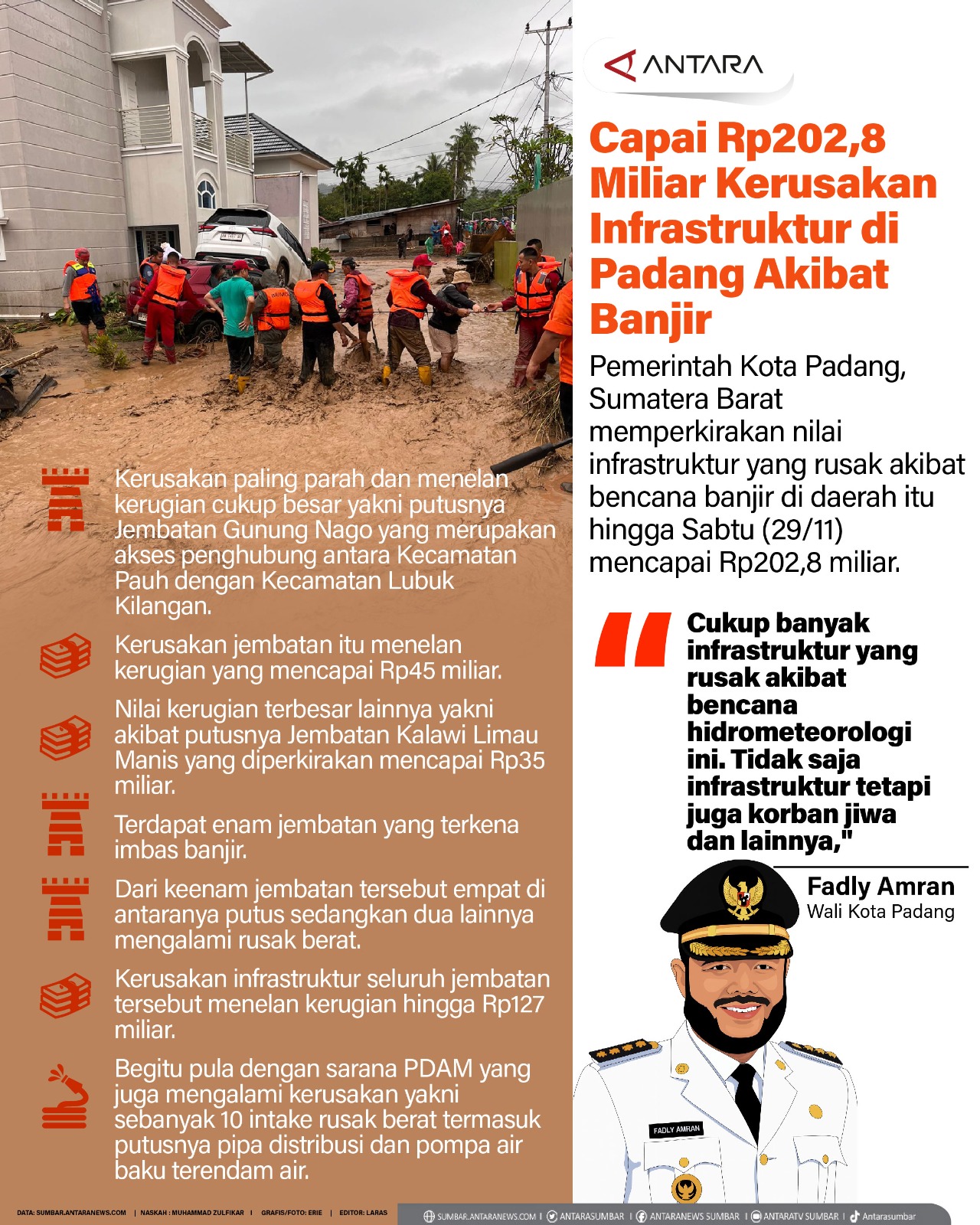 Capai Rp202,8 miliar Kerusakan infrastruktur di Padang akibat banjir Minggu, 30 November 2025 11:29 WIB Pemerintah Kota Padang, Sumatera Barat memperkirakan nilai infrastruktur yang rusak akibat bencana banjir di daerah itu hingga Sabtu (29/11) mencapai Rp202,8 miliar. COPYRIGHT © ANTARA SUMBAR 2025 facebook Twitter Whatsapp pinterest