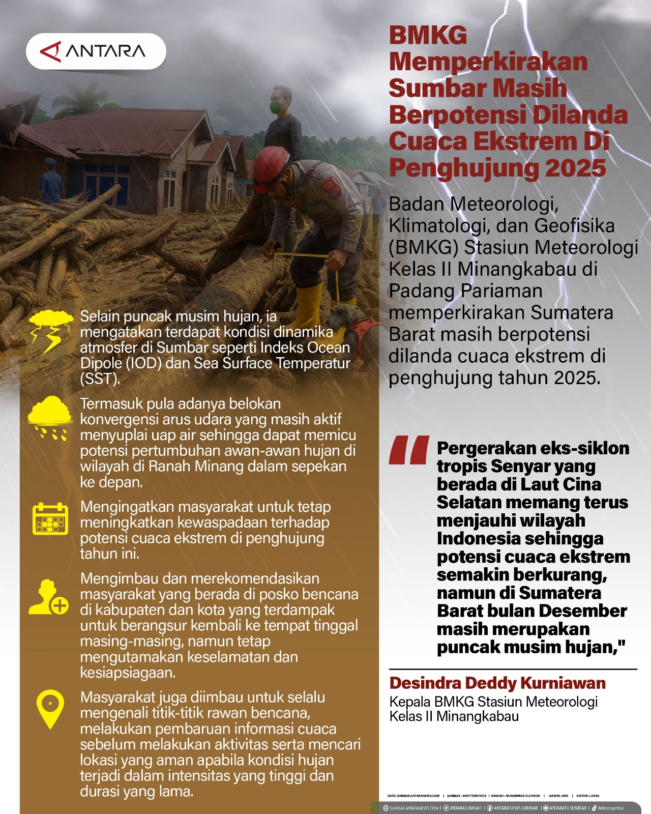 Badan Meteorologi, Klimatologi, dan Geofisika (BMKG) Stasiun Meteorologi Kelas II Minangkabau di Padang Pariaman memperkirakan Sumatera Barat masih berpotensi dilanda cuaca ekstrem di penghujung tahun 2025.