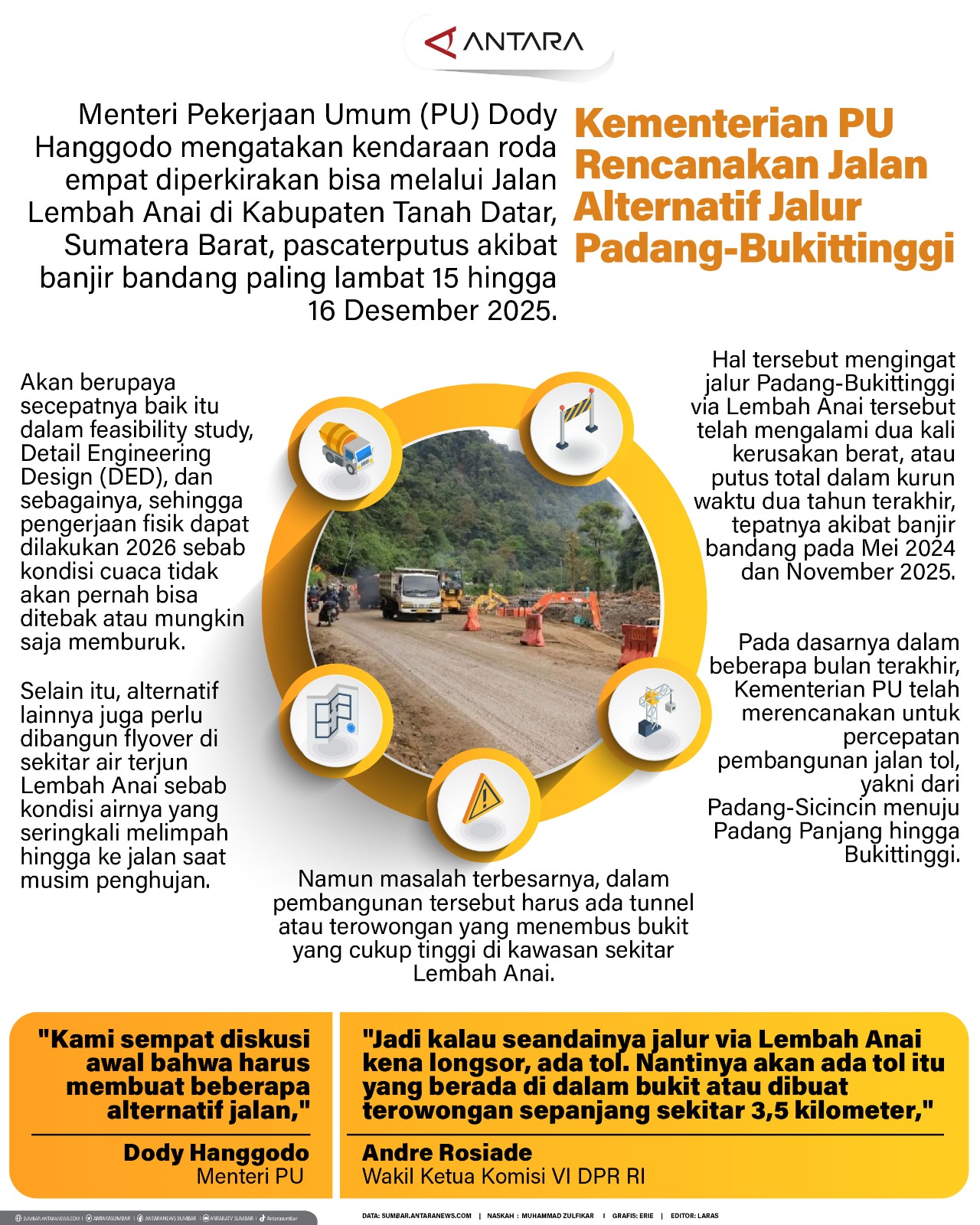 Kementerian Pekerjaan Umum (PU) merencanakan pembangunan jalan alternatif jangka panjang untuk penghubung jalur Padang-Bukittinggi guna mengurangi beban pada area Lembah Anai, Kabupaten Tanah Datar, Sumatera Barat, yang selama ini merupakan akses utama penghubung kedua daerah.