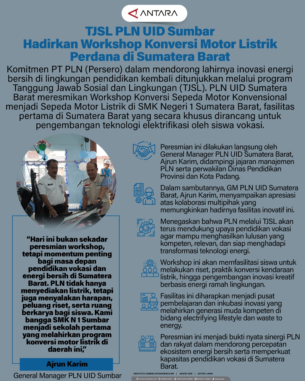 Komitmen PT PLN (Persero) dalam mendorong lahirnya inovasi energi bersih di lingkungan pendidikan kembali ditunjukkan melalui program Tanggung Jawab Sosial dan Lingkungan (TJSL). PLN UID Sumatera Barat meresmikan Workshop Konversi Sepeda Motor Konvensional menjadi Sepeda Motor Listrik di SMK Negeri 1 Sumatera Barat, fasilitas pertama di Sumatera Barat yang secara khusus dirancang untuk pengembangan teknologi elektrifikasi oleh siswa vokasi.
