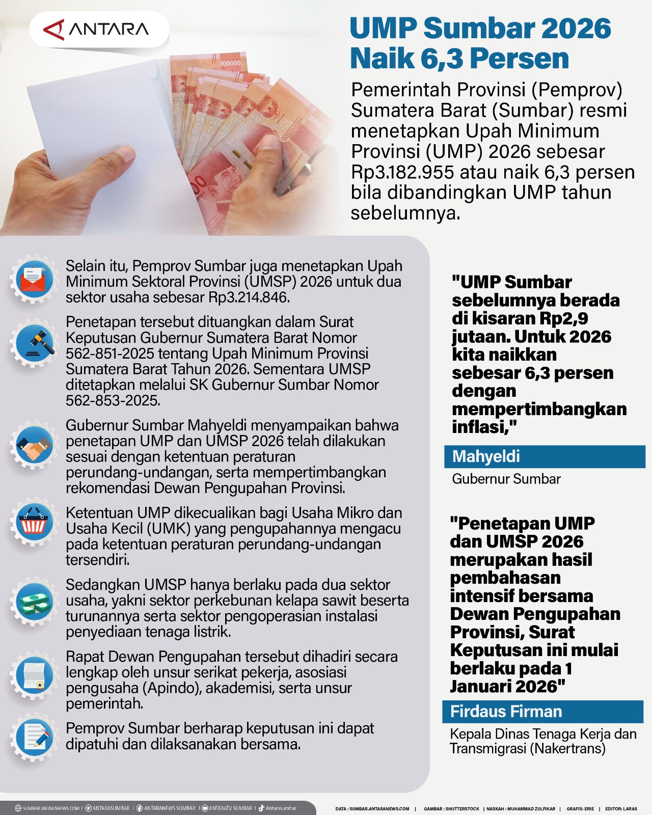 UMP Sumbar 2026 naik 6,3 persen Selasa, 23 Desember 2025 15:01 WIB Pemerintah Provinsi (Pemprov) Sumatera Barat (Sumbar) resmi menetapkan Upah Minimum Provinsi (UMP) 2026 sebesar Rp3.182.955 atau naik 6,3 persen bila dibandingkan UMP tahun sebelumnya. COPYRIGHT © ANTARA SUMBAR 2025 facebook Twitter Whatsapp pinterest